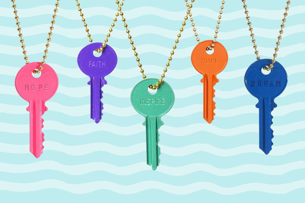 The Giving Keys is a pay-it-forward company that hand stamps products with inspirational words. It donates a portion of its profits to the nonprofit Chrysalis.