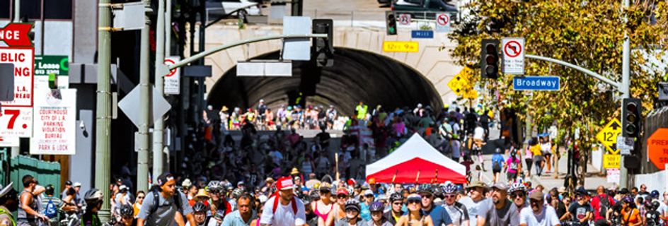 CicLAvia closes streets to cars for a day, and opens them to the community to gather together and bike, skateboard, run, dance, or simply wander. Their latest event on September 30th, Celebrate LA!: LA Phil 100 x CicLAvia, marked the 27th CicLAvia since 2010. In that time, more than 1.6 million people have participated in CicLAvia, which has covered more than 180 miles of LA's streets. CicLAvia is fueling a transformation across the region by inspiring more people to reimagine urban life without a car, and improving personal health and quality of life. More than 50 percent of participants in a recent survey said that they would be inactive if not for CicLAvia. On event days, local air quality improves by 50 percent and Metro ridership increases by 30 percent. As a result, the region has become increasingly connected by public transportation, bike lanes, and pedestrian centers.